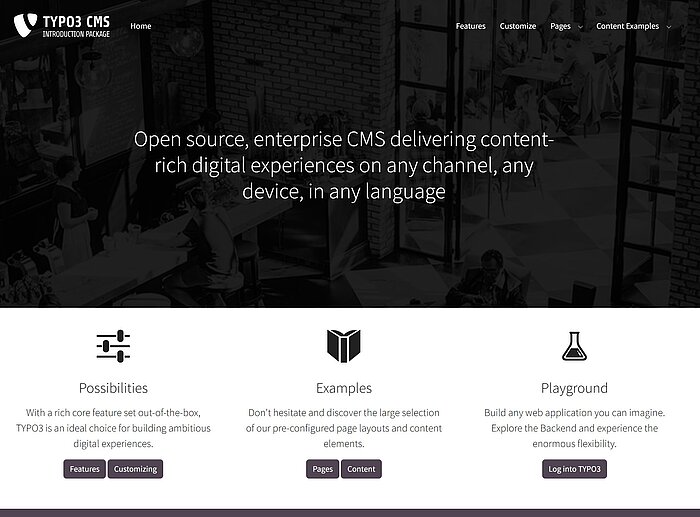 Sie möchten gerne selber eine TYPO3 Website installieren. Mit dem Introduction Package ist das sehr einfach möglich. Es bietet ein vorgefertigtes Layout mit vielen Inhaltselementen, die je nach individuellen Wünschen geändert werden können.