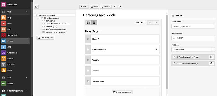 Mit der Forms-Extension können Redakteure bequem eigene Formulare erstellen und auf der Website einbinden.