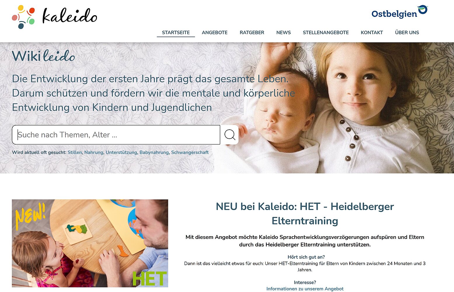Kaleido ist das Zentrum für die gesunde Entwicklung von Kindern und Jugendlichen in der Deutschsprachigen Gemeinschaft Belgiens. Mit einem multidisziplinären Team aus Fachkräften bietet Kaleido präventive und beratende Leistungen für Familien, Schulen und Bildungseinrichtungen. Die Website dient dabei als zentrale Informationsplattform und Anlaufstelle für Bürgerinnen und Bürger, pädagogische Fachkräfte sowie Netzwerkpartner.