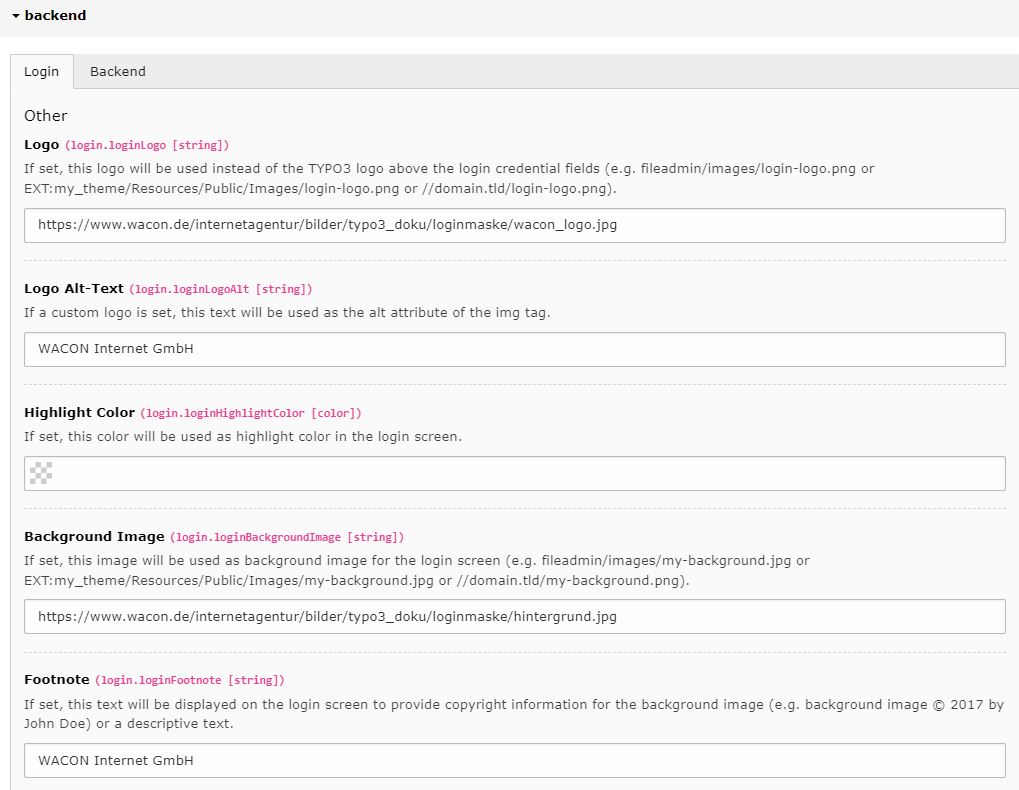 Die Loginmaske kann optisch über Admin Tools → Settings → Extension Configuration → Backend angepasst werden (Hintergrundbild, Logo, etc)