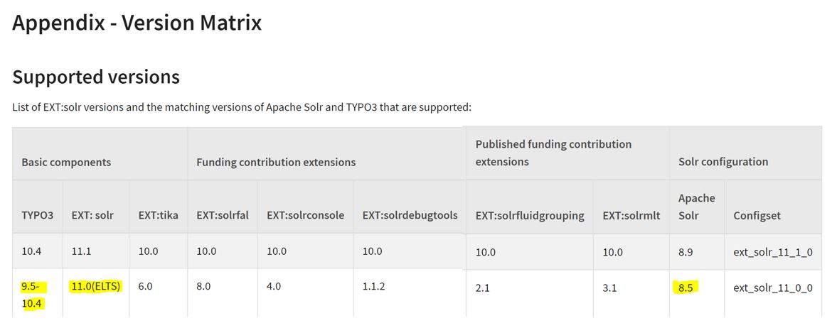 Zunächst ist die Extension solr in der richtigen Version zu installieren. Entscheidend ist dabei vor allem die SOLR-Version (s.o.) des Servers. Die TYPO3-SOLR-Matrinx unter: https://docs.typo3.org/p/apache-solr-for-typo3/solr/main/en-us/Appendix/VersionMatrix.html gibt Aufschluss darüber, welche Version zu verwenden ist: