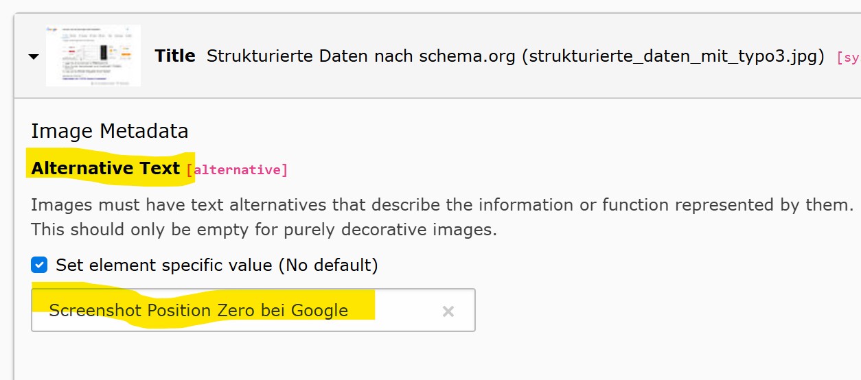 In TYPO3 werden im Inhaltselement die Alt-Texte direkt unter dem Bild im Feld “Alternative Text” angegeben. Sie können auf unter Filelist zentral für das Bild hinterlegt werden.