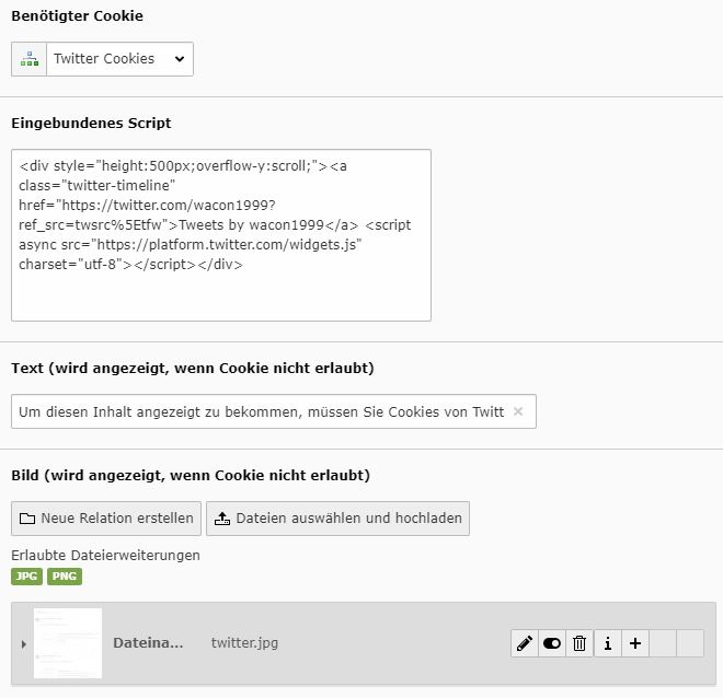 Für Social-Media-Komponenten wie z.B. die Twitter-Timeline oder andere sog. Drittanbieterinformationen, die via iframe eingebunden werden, besteht die Möglichkeit, dem Besucher per Klick auf ein Bild die Freischaltung zu ermöglichen. Hierzu kann der TYPO3 Redakteur an der gewünschten Stelle angeben: