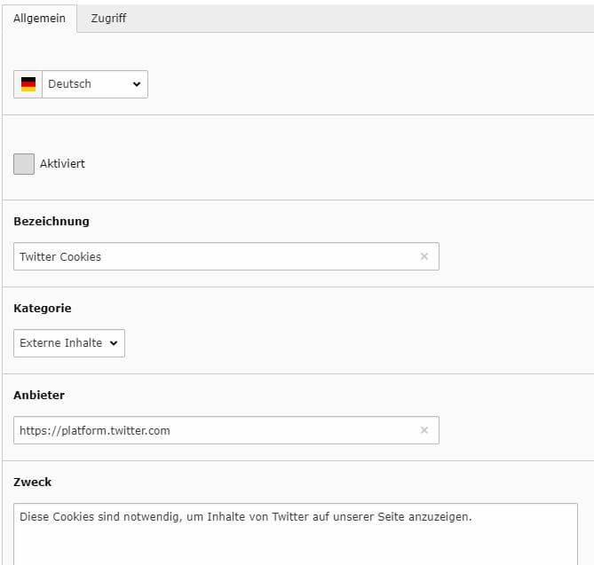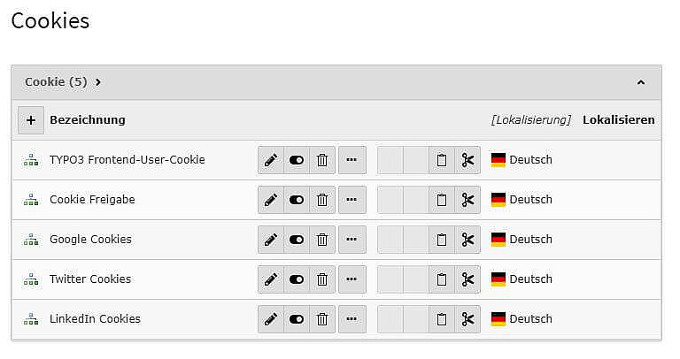 Im Backend von TYPO3 werden die verwendeten Cookies zentral gepflegt: