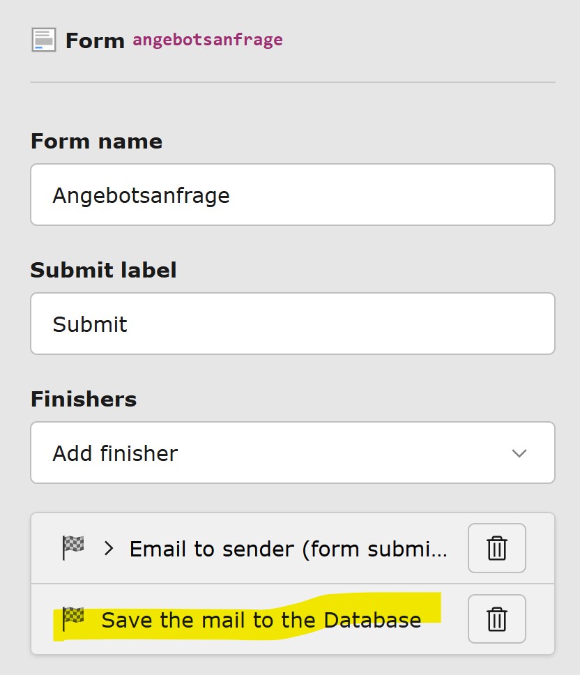 3. jetzt steht in den "forms"-Formularen der Finisher "Save the Mail to the Database" zur Verfügung.