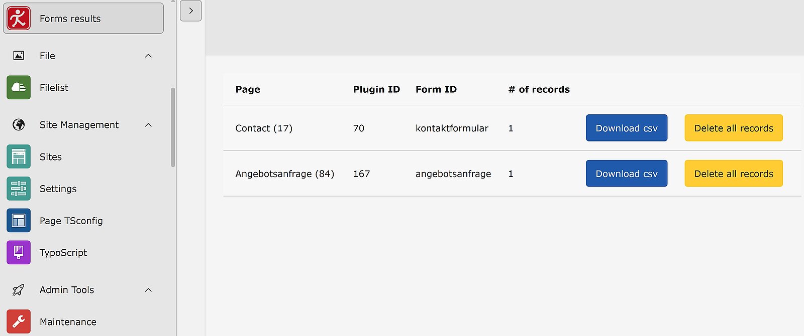 In dem neuen Modul "Forms results" kann man die Daten im CSV-Format exportieren und in anderen Anwendungen (z.B. Excel) weiterverarbeiten. Aus Datenschutzgründen empfiehlt sich eine automatische Löschung über den TYPO3 "Scheduler". Der zu verwendene Task lautet "Table garbage collection".