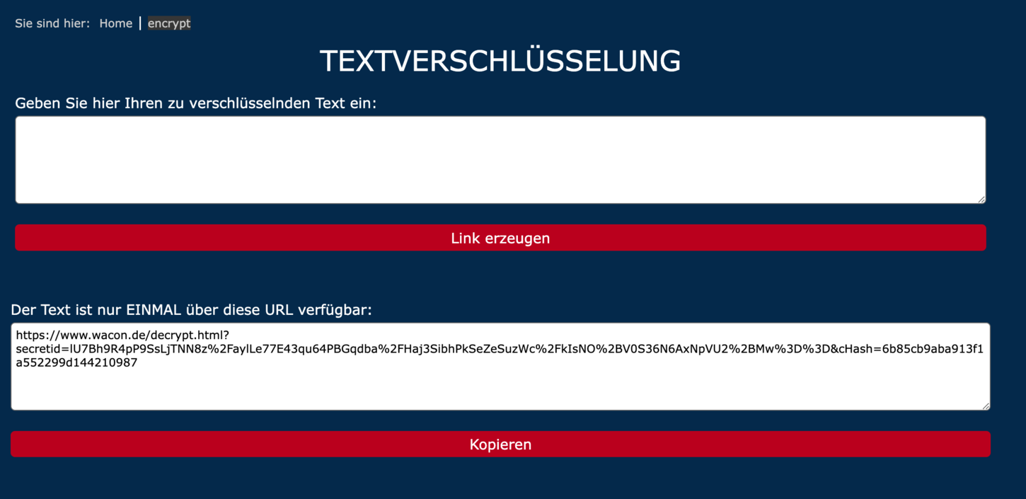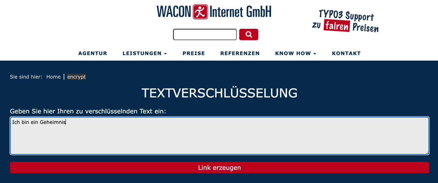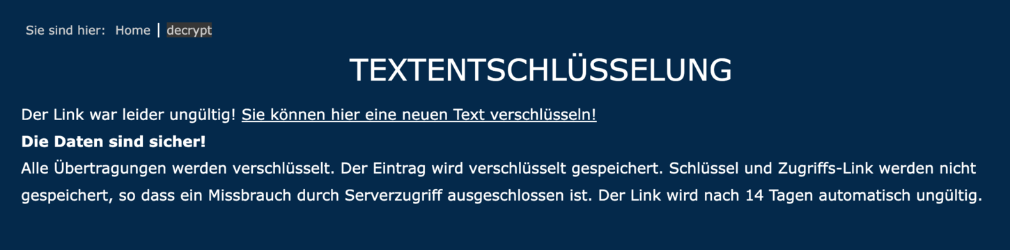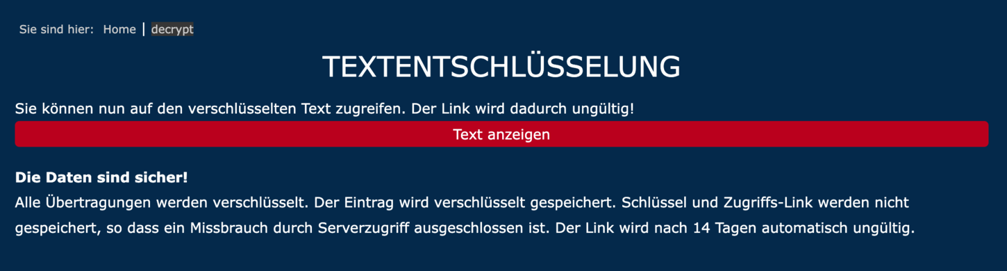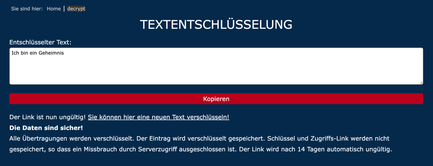 Die von uns entwickelte TYPO3 Extension secrets dient der Verschlüsselung von Nachrichten und Weitergabe als einmal gültigen Link. Die Extension eignet sich für Organisationen, die besonderen Wert auf Sicherheit und Vertrauenswürdigkeit legen. Da die gesamte Kommunikation über den eigenen Webserver erfolgt, sind keine Third-Party-Tools von Servern, deren Standort nicht bekannt (DSGVO) ist, notwendig. Der eigene Domainname im Link ist vertrauenswürdiger und macht einen profressionelleren Eindruck.