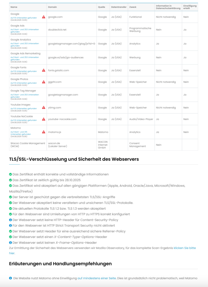 Das Audit prüft, ob die Internetseite die datenschutzrechtlichen Anforderungen erfüllt – insbesondere im Hinblick auf die DSGVO. Dabei wird kontrolliert, welche personenbezogenen Daten erhoben werden (z. B. über Kontaktformulare oder Cookies), ob eine gültige Rechtsgrundlage vorliegt und ob Besucher ordnungsgemäß informiert und ihre Einwilligung eingeholt wird. Auch technische Aspekte wie Content Security Policy und die Gültigkeit des SSL-Zertifikats werden überprüft. Ziel ist es, Risiken zu erkennen, rechtliche Verstöße zu vermeiden und die Website datenschutzkonform zu gestalten.