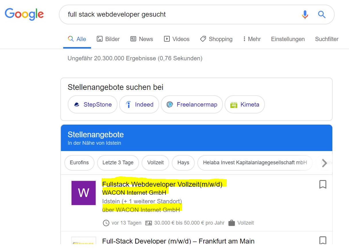 Google bietet mittlerweile eine eigene Sektion "Offene Stellen", die - ebenfalls als Featue Snippet - unter bestimmten Umständen im Suchergebnis ganz oben erscheint. Der Datentyp nennt sich JobPosting.