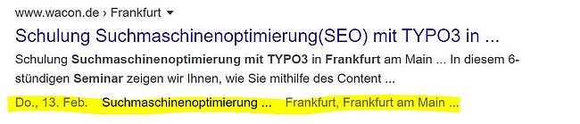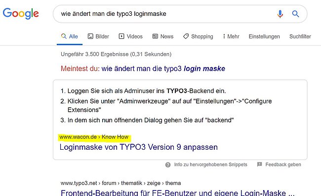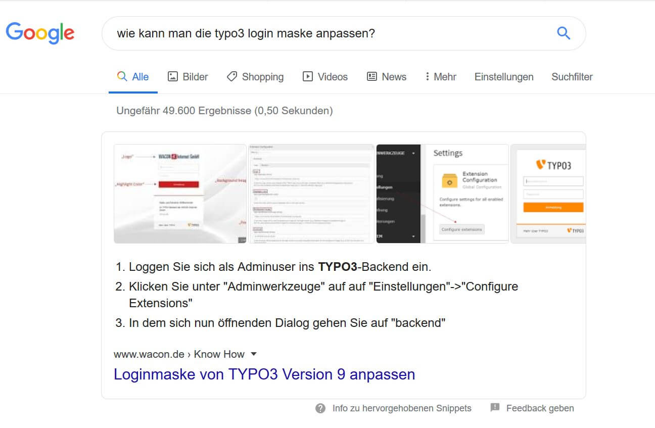 Der Kampf um die obersten Plätze im Suchmaschinenergebnis ("SERP" = Search Engine Result Page) kann ziemlich frustrierend sein. In jedem Fall ist er aber eins: sehr zeitaufwändig. Hinzu kommt der Trend von Google, Suchanfragen direkt selber zu beantworten und die Quelle(Website) zu verlinken. Und zwar noch vor den bezahlten Anzeigen. Man spricht hier auch von der Position Zero, die natürlich sehr begehrt ist. Die klassischen, "organischen" Ergebnisse fallen dadaurch meistens weit nach unten. Durch den Einsatz von sog. strukturierten Daten nutzen Sie eine noch recht junge Technologie, um die Sichtbarkeit Ihrer Website in Suchmaschinen zu verbessern. Einmal in TYPO3 eingerichtet, erfolgt die Erstellung der strukturierten Daten automatisch anhand der redaktionell gepflegten Daten. Der Aufwand für Redakteure ist somit relativ gering. Weiter unten erklären wir, wie ein Redakteur auch selber gezielt strukturierte Daten einsetzen kann.