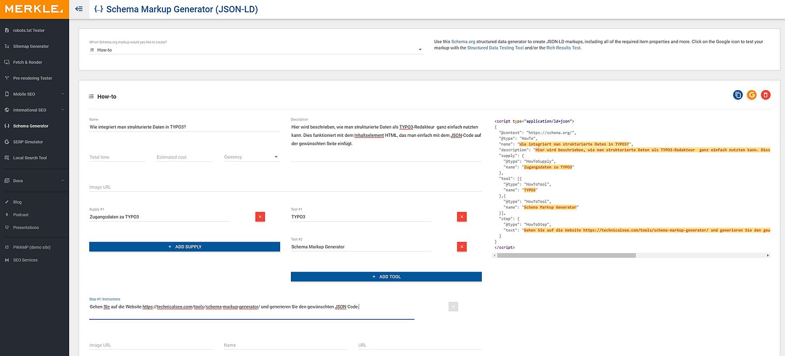 - Gehen Sie auf eine schema-generator Website und generieren Sie den gewünschten JSON Code(oder erstellen Sie die strukturierten Daten manuell).