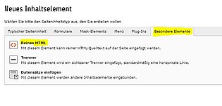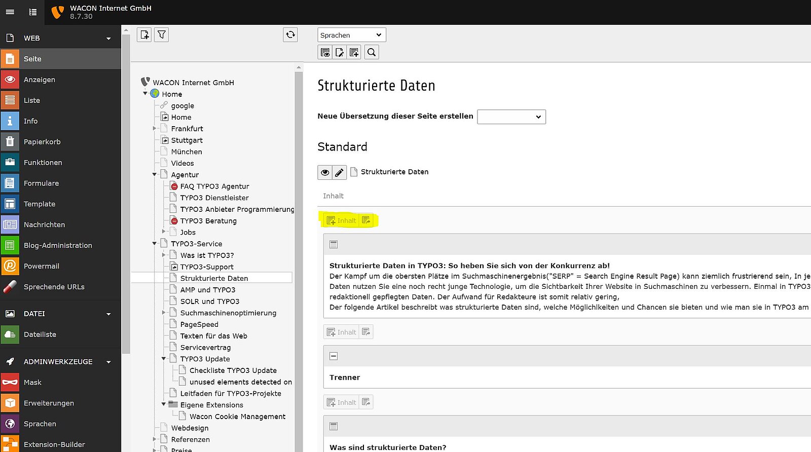 - Wechseln Sie im TYPO3-Baum auf die Seite, auf der die strukturierten Daten eingefügt werden sollen und fügen Sie dort ein neues Inhaltselement ein.