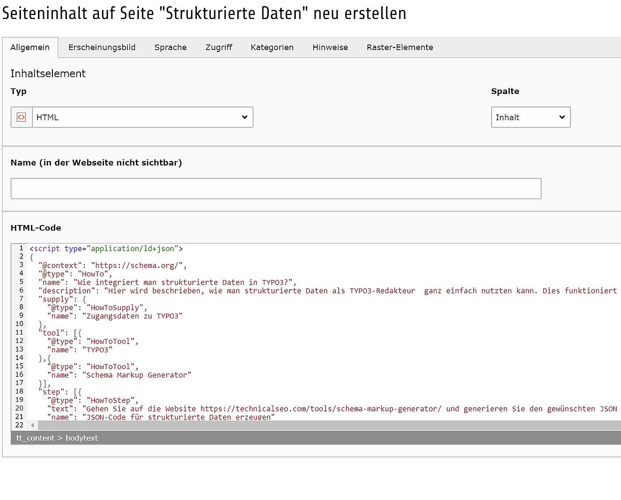Sie können mit dem HTML-Inhaltselement strukturierte Daten in TYPO3 OHNE Programmierkenntnisse einsetzen. Sicher ist das nicht immer die eleganteste Art. Wenn Sie z.B. viele Kurse anbieten, Artikel publizieren oder Produktbewertungen ermöglichen, macht es Sinn, durch entsprechende Anpassungen im TYPOSCRIPT, in Fluid oder direkt in der Extension eine automatisierte Generierung strukturierter Daten zu ermöglichen. Für spezielle Fälle kann aber auch das folgende Vorgehen sinnvoll sein: