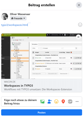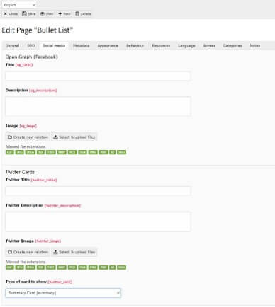 Sowohl TwitterCards als auch die OpenGraph-Metatags lassen sich in TYPO3 bequem über die Registerlasche “Social media” einpflegen: