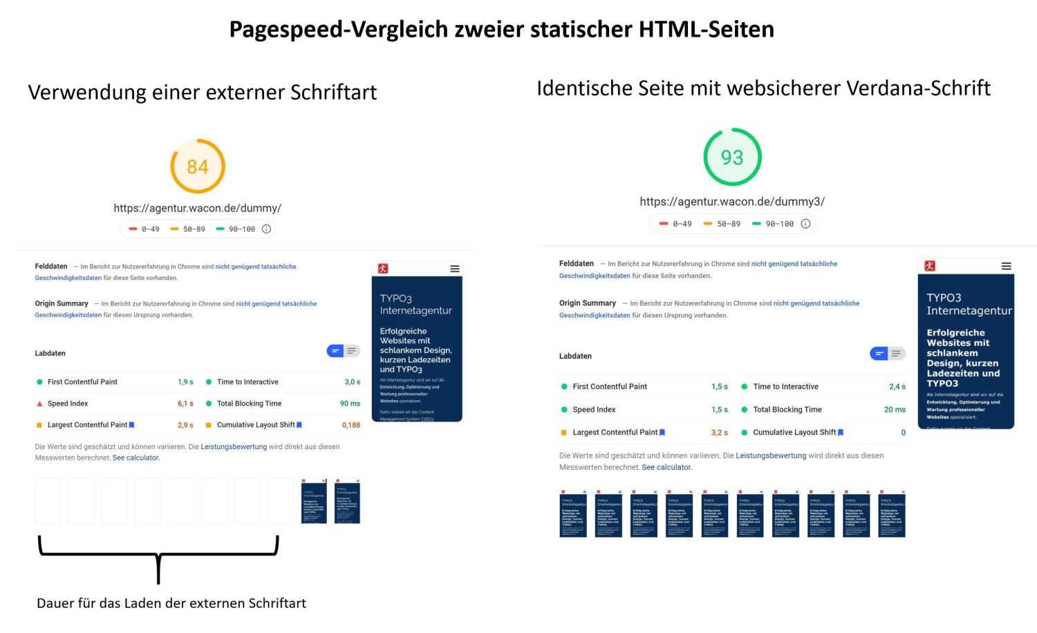 Um die Auswirkungen der gewählten Schriftart auf den Pagespeed und der Core Web Vitals messen zu können, haben wir zwei statische Seiten auf denselben Webspace gelegt und mit dem Pagespeed-Tool von Google aufgerufen. Beide Seiten sind bis auf die verwendete Schriftart identisch.