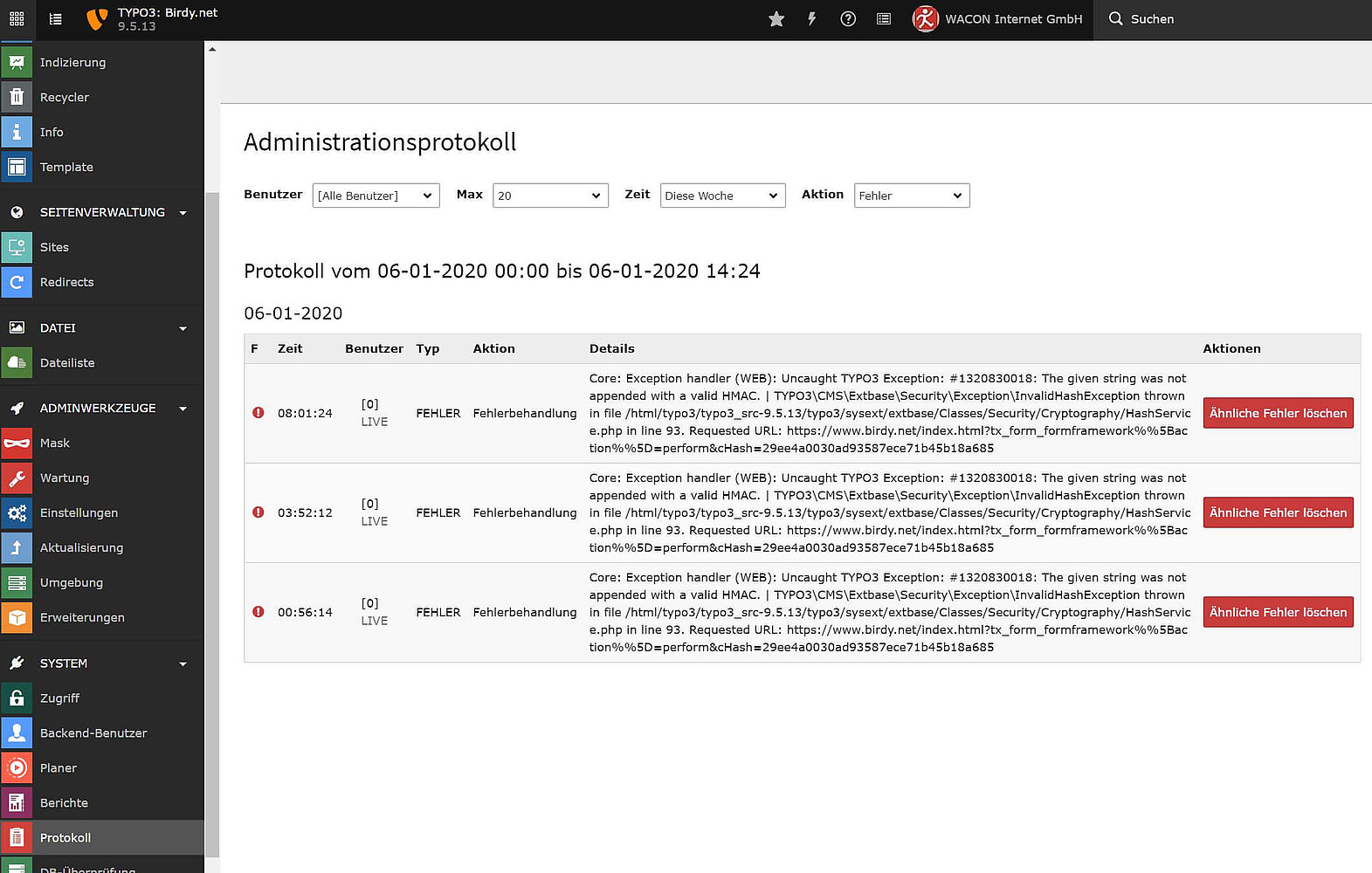 Im Statusbericht werden mögliche Systemfehler (veraltete TYPO3-Version, falsches Datenbank-Format, SOLR-Probleme etc.) angezeigt. Während gelb hinterlegte Meldungen als Warnungen zu verstehen sind, sollten Sie roten Meldungen unverzüglich nachgehen und beseitigen.