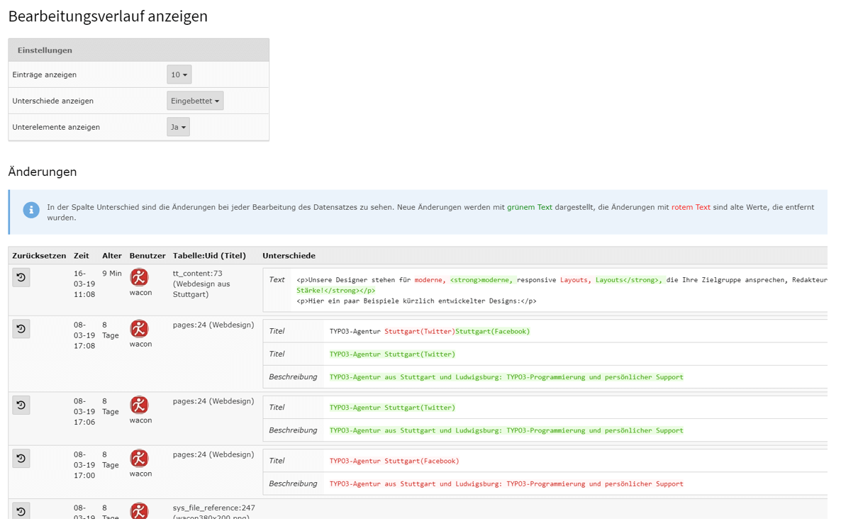 Mit der Papierkorbfunktion (Recycler) können gelöschte Seiten oder Seiteninhalte wieder hergestellt werden. Aber TYPO3 kann noch mehr: Für jede Seite und jedes Inhaltselement kann der sog. Bearbeitungsverlauf angezeigt werden. Dort kann man sehen, welche Änderungen wann und von wem bislang gemacht wurden UND kann diese rückgängig machen.