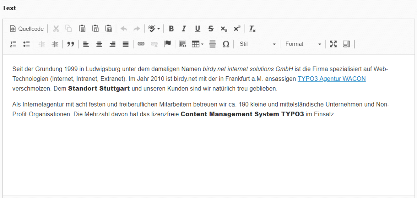 Mit dem Rich Text Editor (RTE) können Sie - wie bei vielen anderen Content Management Systemen auch - Texte pflegen und visuell anpassen, Verlinkungen erstellen, den HTML-Quellcode direkt bearbeiten und eigene Layout-Stile für Texte anwenden. Für die TYPO3 Version 9 wurde der RTE noch einmal deutlich verbessert.