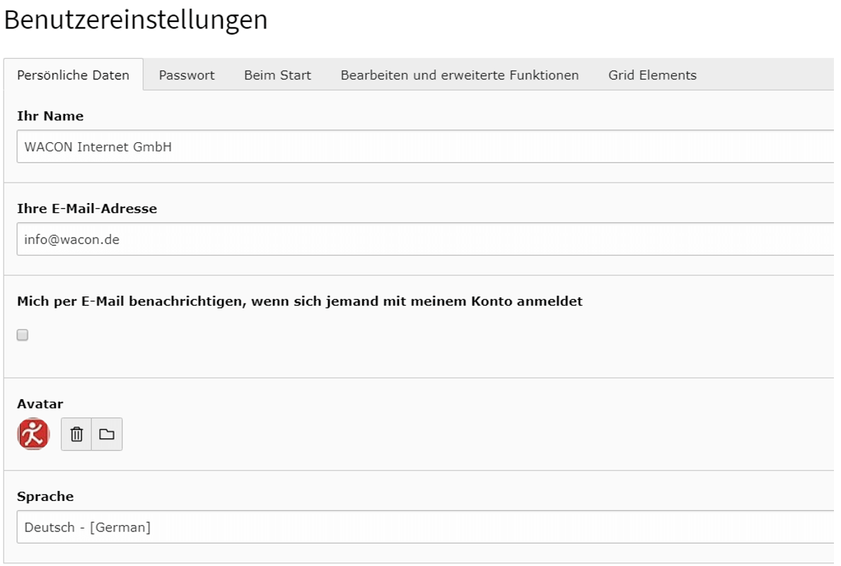 Jeder Redakteur hat die Möglichkeit, seine persönlichen Einstellungen und die des Backends individuell einzustellen. Hierzu zählen: Die verwendete Sprache, das Passwort, ein Avatar zur Wiedererkennung, die gewünschte Startseite, Benachrichtigungsfunktionen u.v.m. In TYPO3 hat ein Redakteur die Auswahl über mehr als 120 Sprachen(!!). Eine weitere Besonderheit dieses außergewöhnlichen CMS. Wie Sie eine Backendsprache in TYPO3 ändern, erfahren Sie in unserem Lernvideo "Sprache im TYPO3 Backend ändern".