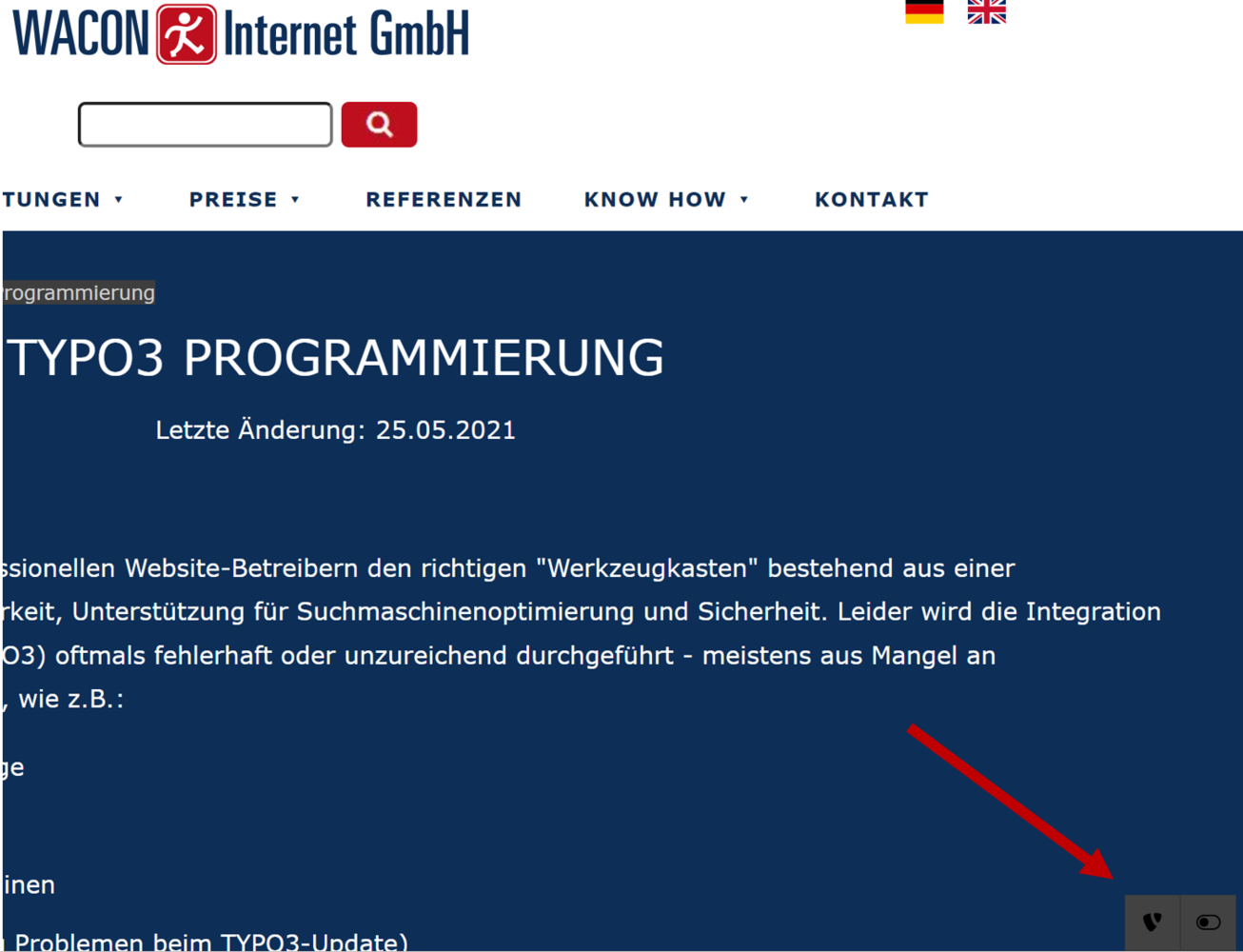 Das Admin-Panel kann für unterschiedliche TYPO3-Anwendergruppen (Developer, Integratoren, Redakteure, etc.) ein nützliches Tool bei der Fehlersuche oder Qualitätskontrolle in TYPO3-Systemen sein. Nach der Aktivierung (s.u. "Technisches") erscheint für eingeloggte TYPO3-User rechts unten ein Kipp-Schalter, mit dem das Tool dann angezeigt bzw. wieder versteckt werden kann.