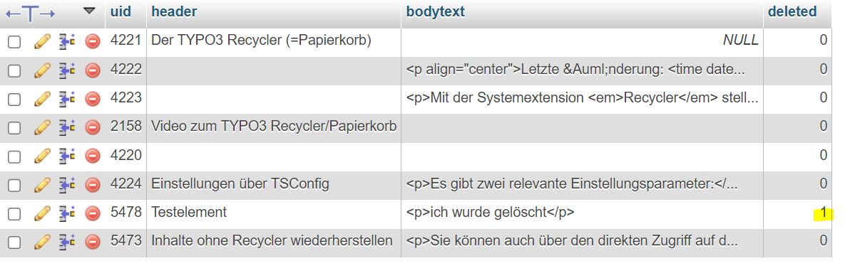 Sie können auch über den direkten Zugriff auf die Datenbank versehentlich gelöschte Inhaltselemente wiederherstellen (falls der Recycler noch nicht installiert ist). TYPO3 löscht Datensätze nämlich nicht sofort. Stattdessen gibt es in der Tabelle tt_content ein Feld deleted. Ist der Wert auf "1", gilt das Element als gelöscht und wird im Backend nicht mehr angezeigt (im Gegensatz zum Feld hidden, bei dem das Element nur im Frontend nicht mehr angezeigt wird). Sämtliche Daten sind aber noch da.