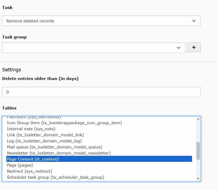Wenn Sie TYPO3-Inhalte physikalisch und damit endgültig aus der Datenbank löschen möchten, können Sie dazu entweder manuell den Recycler verwenden oder einen scheduler-Task ("Remove deleted records") definieren, der dies automatisch tut: