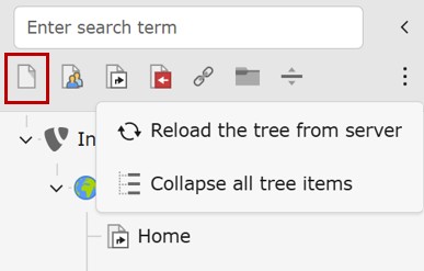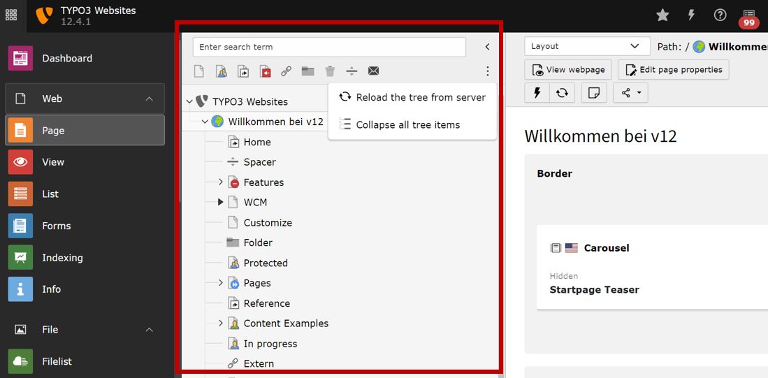 Hinter dem Dreipunkt-Menü befinden sich außerdem die Funktionen zum Neuladen des Seitenbaumes ("Reload the tree vom server"), was manchmal erforderlich sein kann, wenn man neue Seiten nicht “sieht”. Außerdem kann man den gesamten Seitenbaum "einklappen" ("Collapse all tree items"), so dass man nur noch die Root-Seite(n) der TYPO3-Instanz angezeigt bekommt.